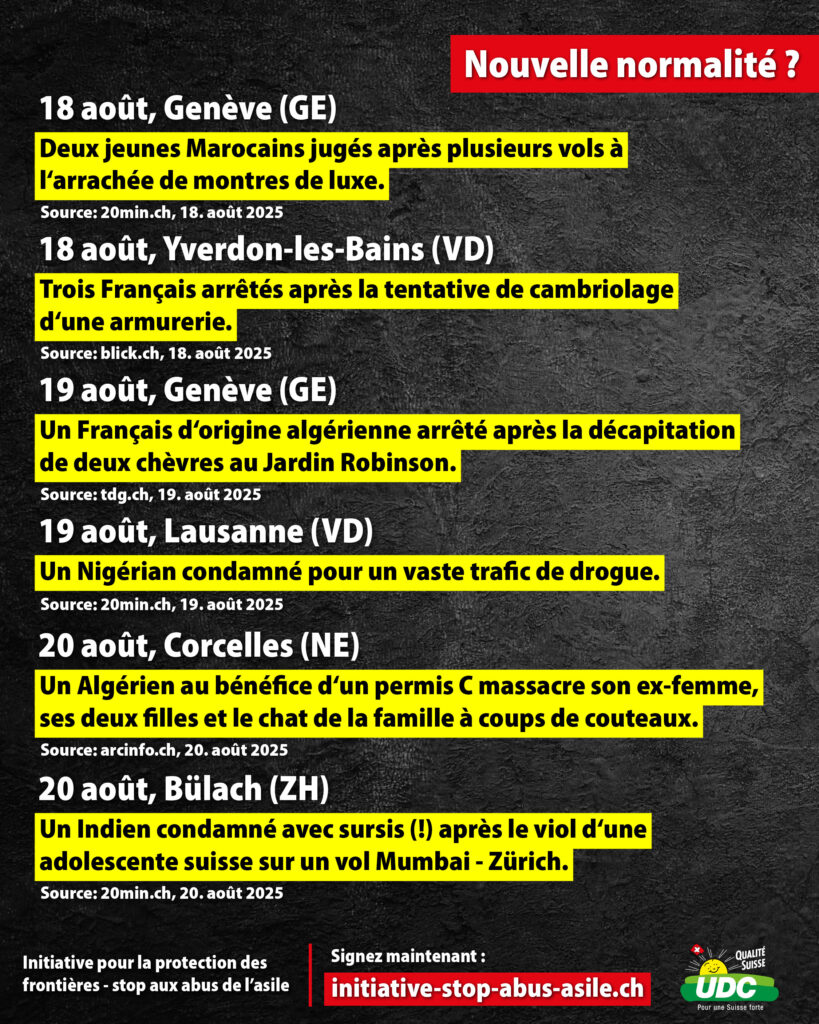 La Suisse est de moins en moins sûre, en raison de l’importation d’une criminalité qui profite du laxisme de la politique migratoire et des frontières passoires. L’UDC est le seul parti à s’engager réellement contre l’immigration de masse et pour la protection des frontières.